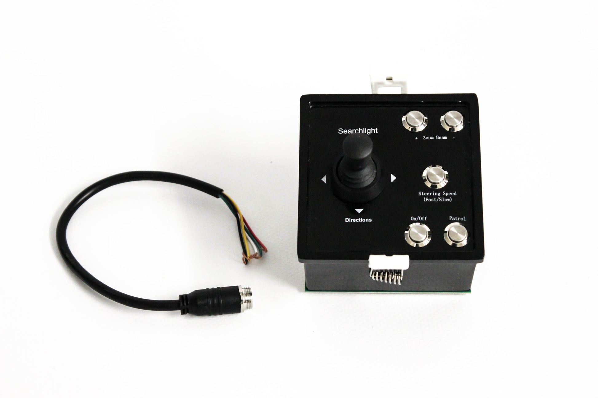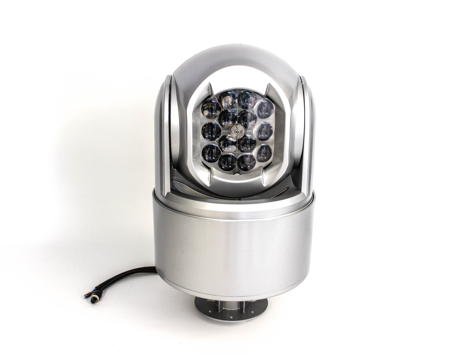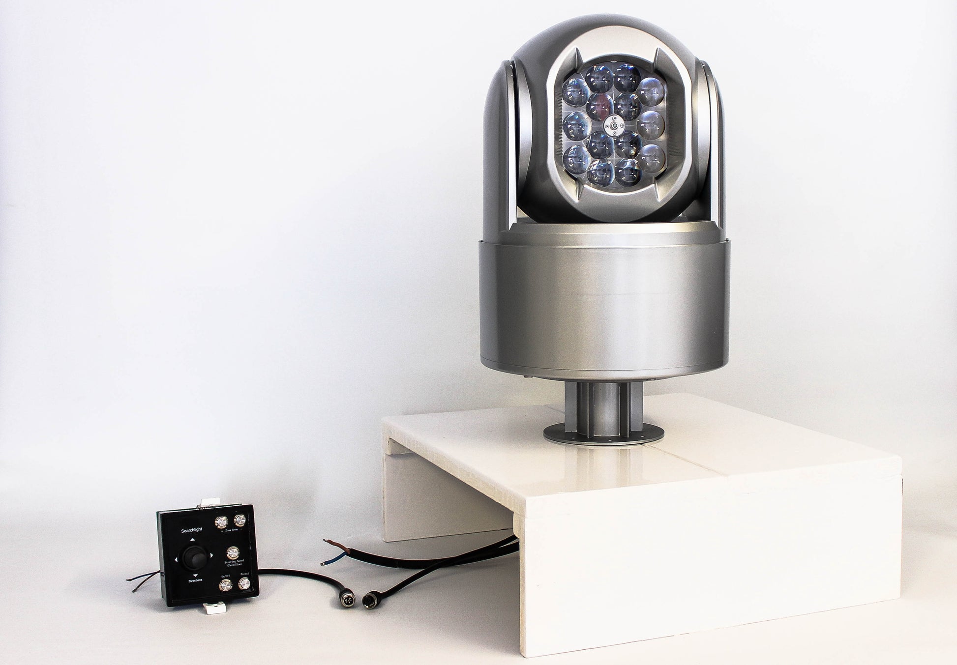 Der Suchscheinwerfer lässt sich wahlweise per kabelgebundenem Joystick-Bedienpult oder per drahtloser Handfernbedienung steuern. Zwei Geschwindigkeitsstufen (schnell und langsam) ermöglichen eine präzise Ausrichtung. Mit bis zu 240° Schwenkbereich und bis zu 90° Neigung sowie einem Zoom von 3° bis 25° passt sich der Lichtkegel flexibel an verschiedene Einsatzsituationen an.